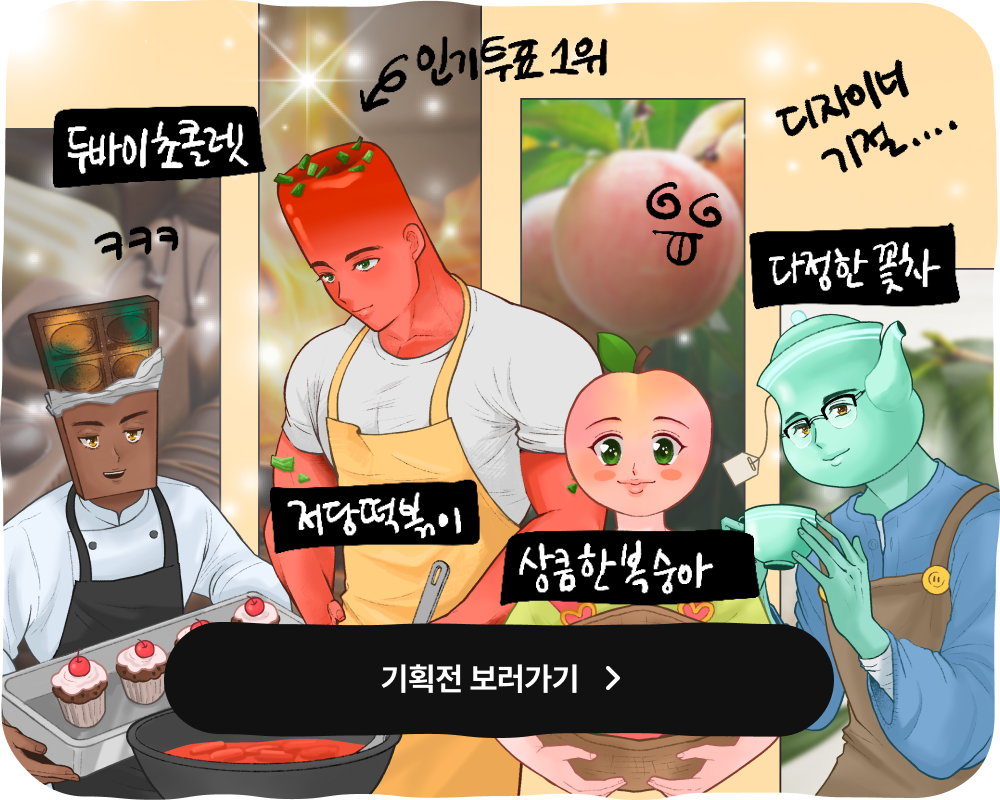 이들이 누굴까 궁금하시죠? 바로 텀블벅 디자이너의 손끝에서 탄생한 역작입니다. 어떻게 더욱 색다르게 큐레이션을 선보여 드릴 수 있을지 고민하다가, 푸드 아이템을 유쾌하고 독특한 캐릭터로 풀어내 보기로 했죠.